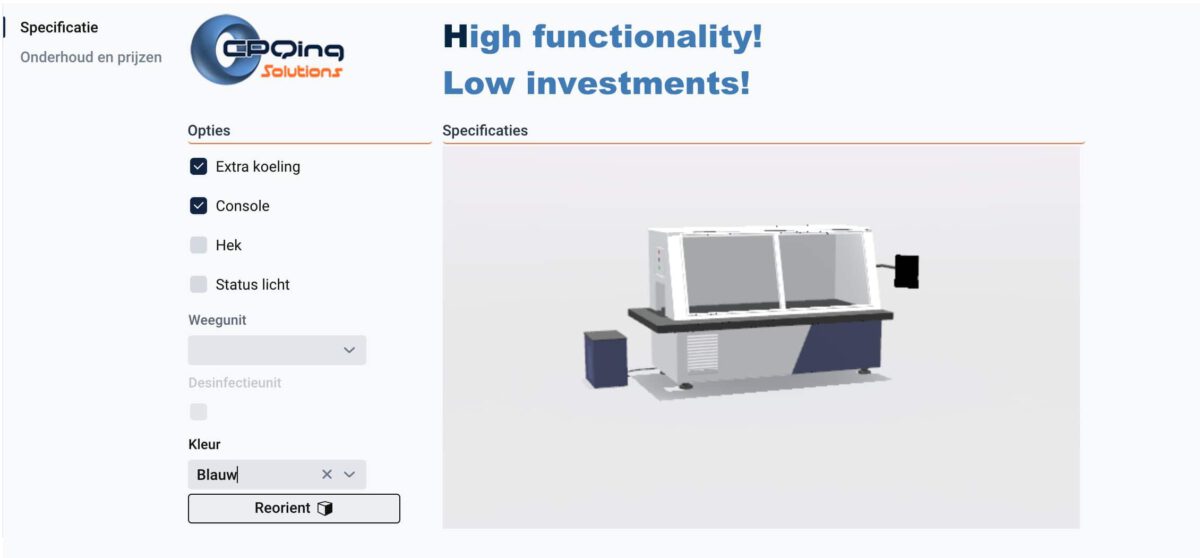 You can design the user interface of the CPQing Configurator to your own wishes, fully integrated into your own website. With or without dynamic images or other visualizations – of course the choice is yours. Our consultants help you make the choice that best suits your wishes and organization. After all, your customer has different needs than a sales in your company. We call this the “Form follows function” principle.